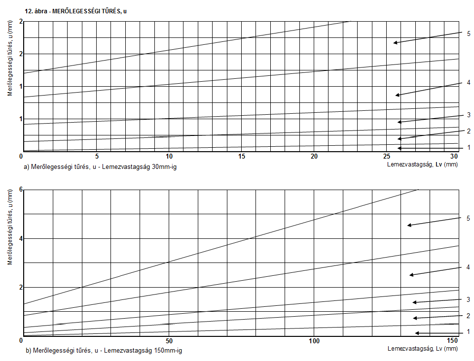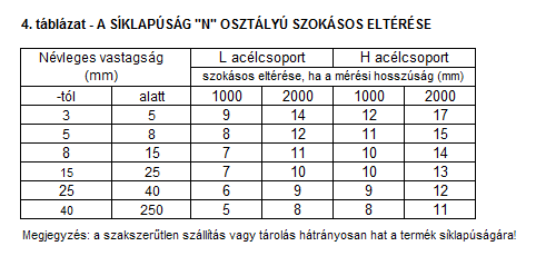 A lemezek vonalzóval való két érintési pontja közötti 1000 mm-nél kisebb távolság esetén a következő síklapúság-eltérésre vonatkozó előírás érvényes: az L acélcsoport esetében a 300-1000 mm közötti tartományban a két érintési pont közötti távolságnak legfeljebb 1%-a, a H acélcsoport esetében pedig legfeljebb 1,5%-a legyen, de a 4. táblázatban előírt értékeket ne haladja meg.