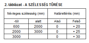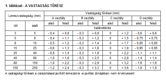 A Táblalemezek vastagságtűrését az 1. táblázat, a szélesség tűrését a 2. táblázat, a hosszúság tűrését pedig a 3. táblázat tartalmazza. A felület megengedett hibáira, valamint azok eltávolítására és javítására az EN 10163. számú szabvány 1. és 2. része tartalmaz előírást