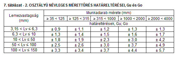Az Inox Service Hungary Kft. által használt 2. osztályú névleges mérettűrés határeltéréseit (Gu és Go) a 7. táblázat tartalmazza. Plazmavágó berendezéseink, alapban, a „+” értékű határeltérések szerint vannak beállítva. A „+/–” értékű vágási tűrésbeállítás igényét a rendeléskor külön kell jelezni.